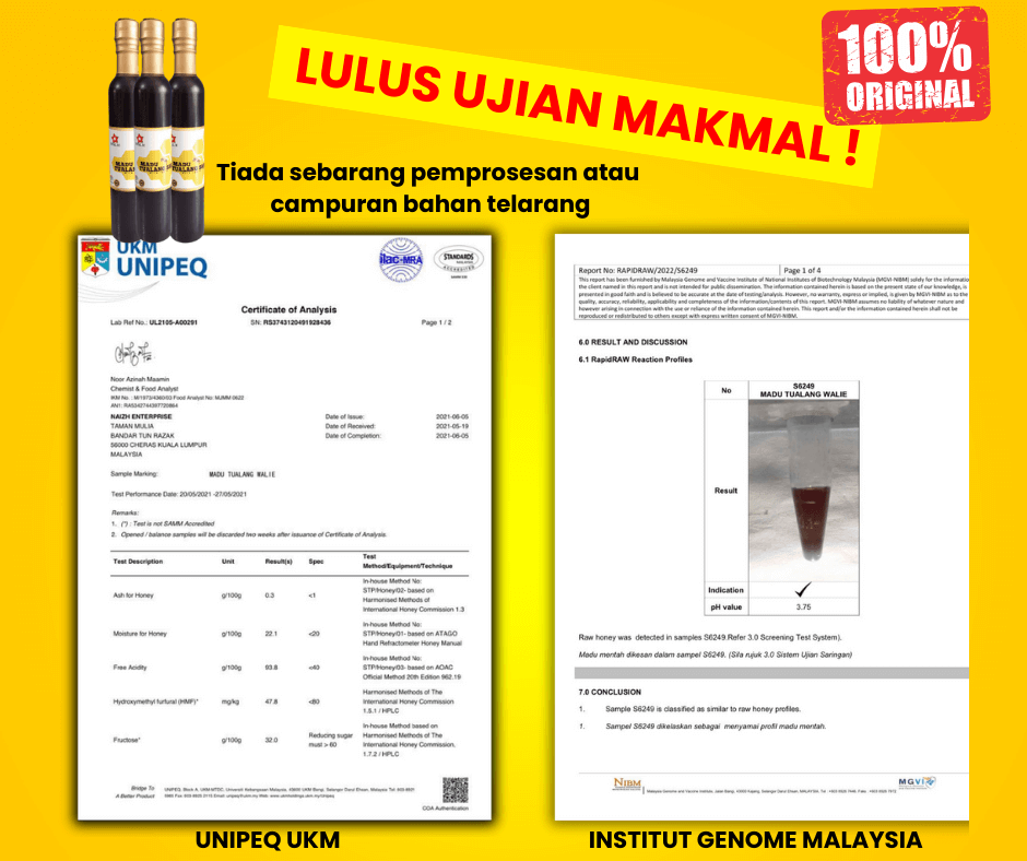 kami sangat berharap jika anda rasa ragu dengan madu kami.. tolong anda buat ujian makmal ini. Jika terbukti madu tualang walie tidak asli, kami pulangkan wang anda sebanyak 5 kali ganda.